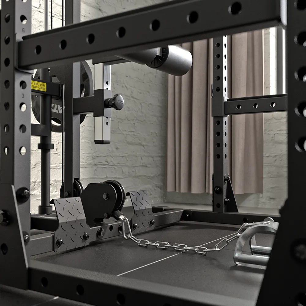 Anbaustation in zwei unterschiedlichen Höhen Kompatibel zu ATX® Power Racks PRX-510 / PRX-510-XS / PRX-520 / PRX-520-XS Mit Doppelseitiger Schlittenführung auf Stahlwellen hervorragende seidenweiche Laufeigenschaften auch bei schweren Gewichten Gewichtsübersetzung 1:1 Hantelscheibenaufnahme Ø 30 mm + optional einfach mit Adapter auf Ø 50 mm umrüstbar Obere & untere Zugfunktion - ohne Umbau nutzbar Kugelgelagerte Seilrollen Dehnungsfreies Stahlseil mit Schutzummantelung Führungswellen aus Vollstahl Individuell höhenverstellbare Beinstütze - für eine sichere Fixierung bei schweren Zugübungen von Oben Rutschsichere Fußstützen aus Stahlblech - für maximale Stabilität beim sitzenden Rudern Schwer belastbar - bis 150 kg Mit gummierten Standfüßen - bodenschonend und rutschsicher Inkl. Verbindungsschrauben + 2 Karabinerhaken