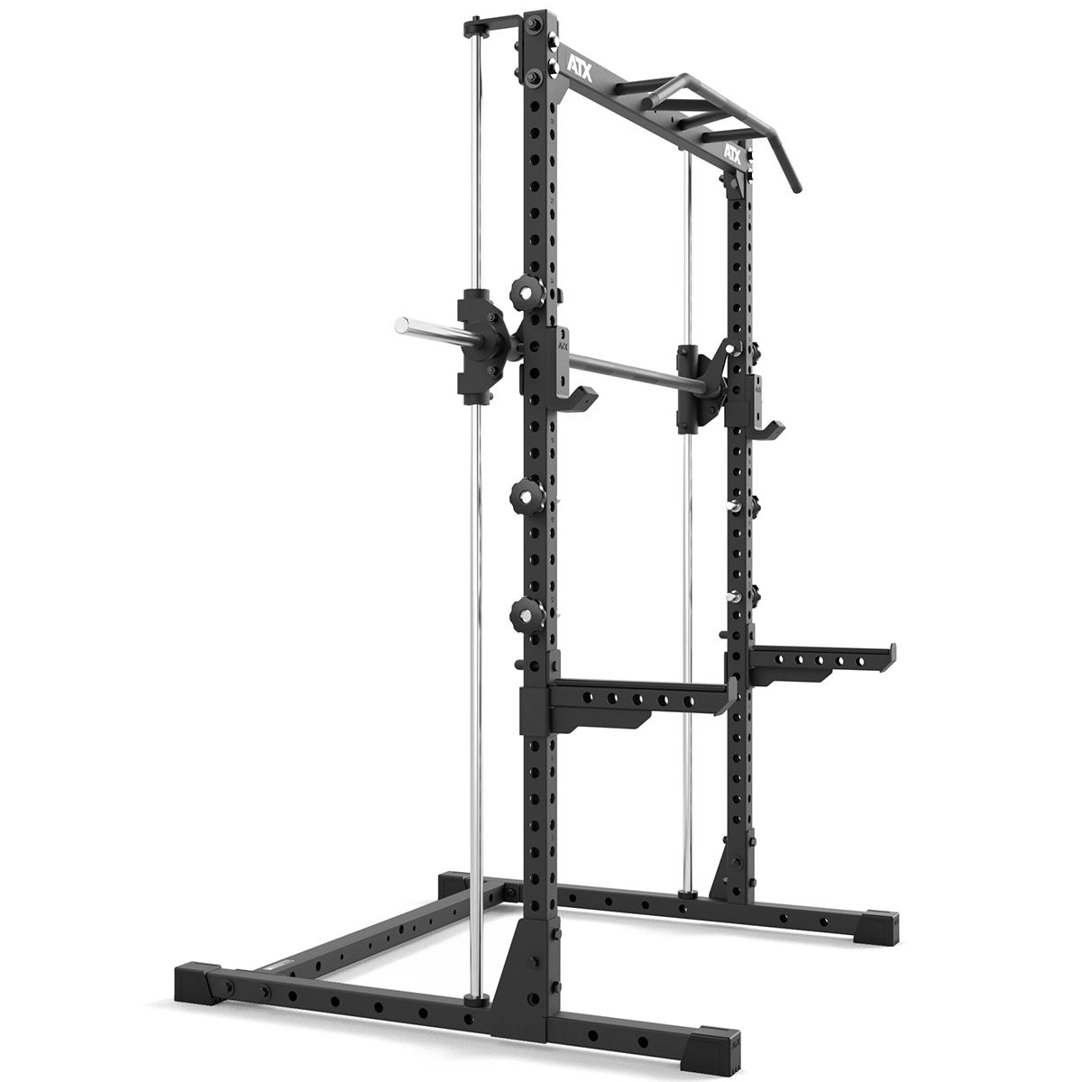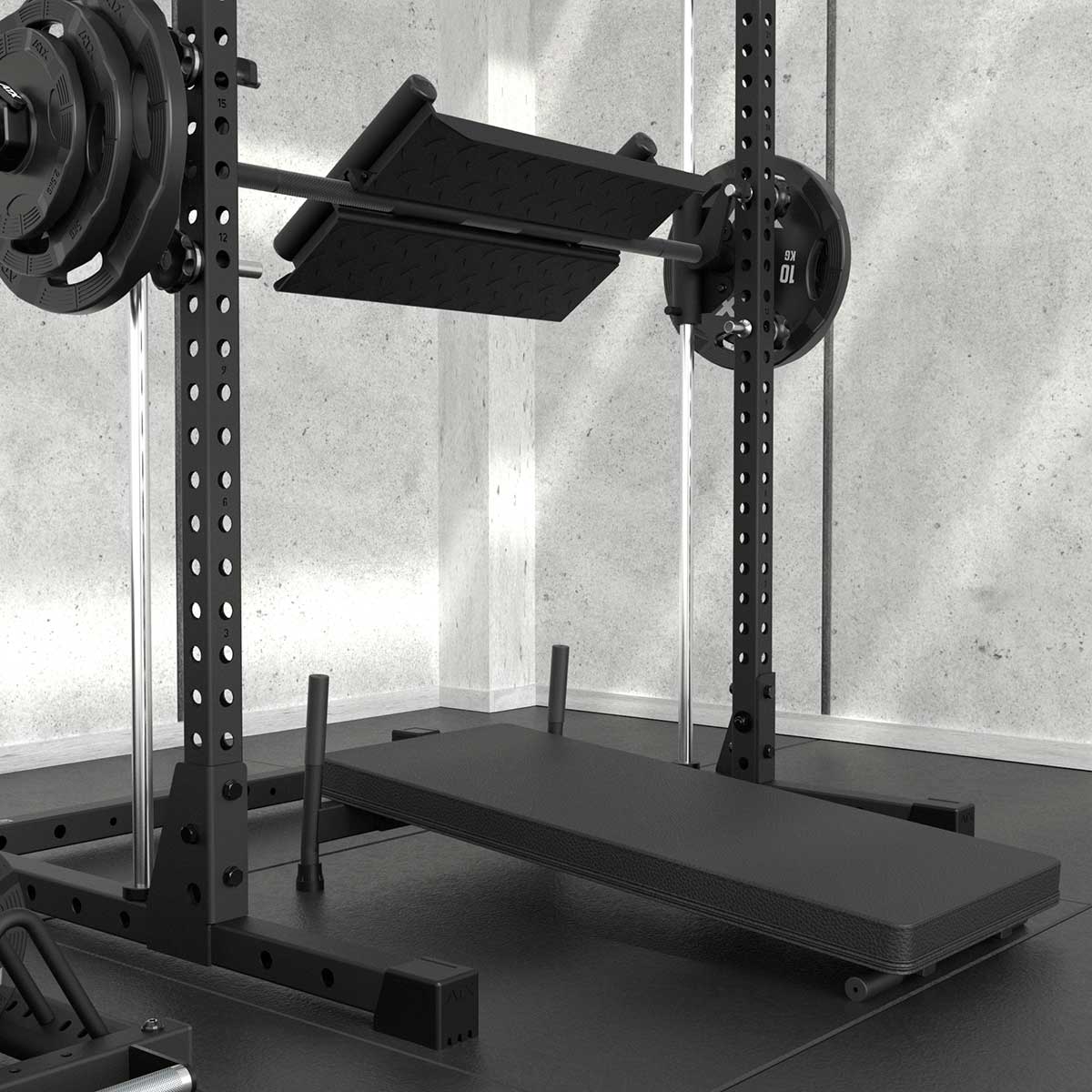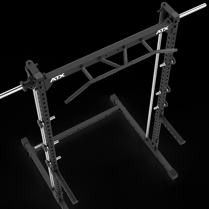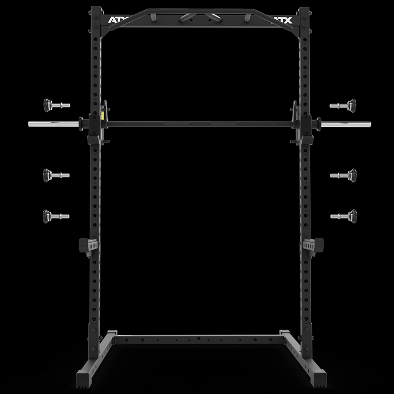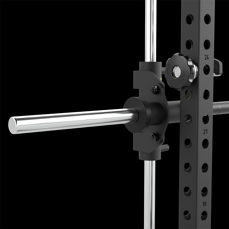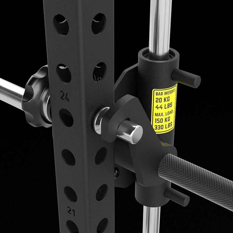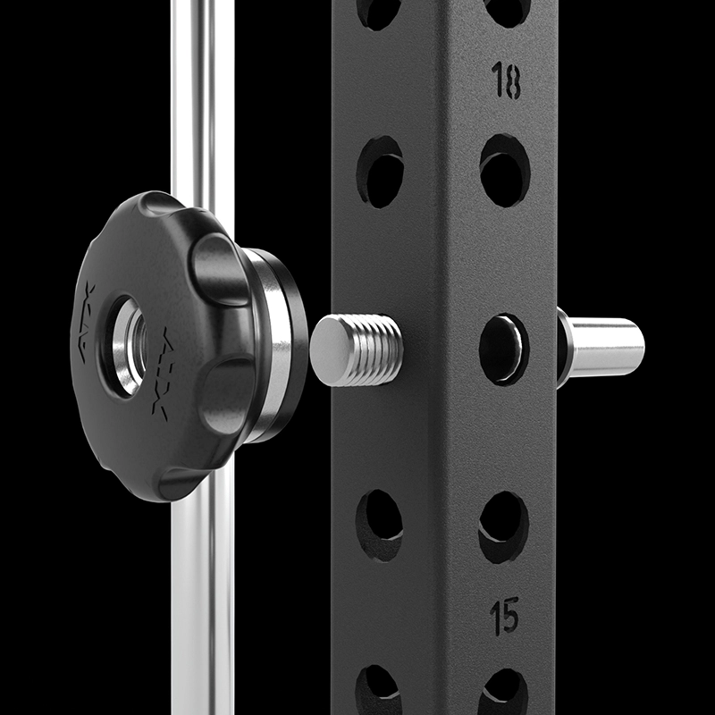 | MAXIMALE RANGE OF MOTION Extra tiefer Ansatz und extra hoher Auslauf der Führungswellen gewähren größtmöglichen Bewegungshub. | START-ABLAGEBOLZEN AUS VOLLSTAHL 6 Start-Ablagebolzen sind schnell und einfach individuell am Rack sicher fixierbar. |