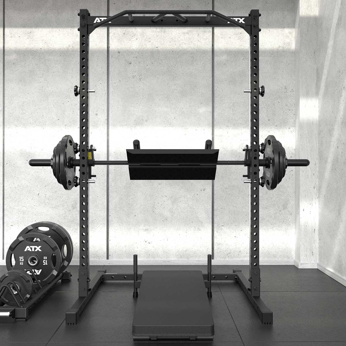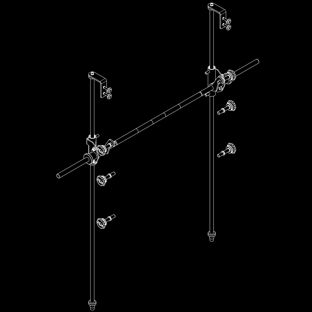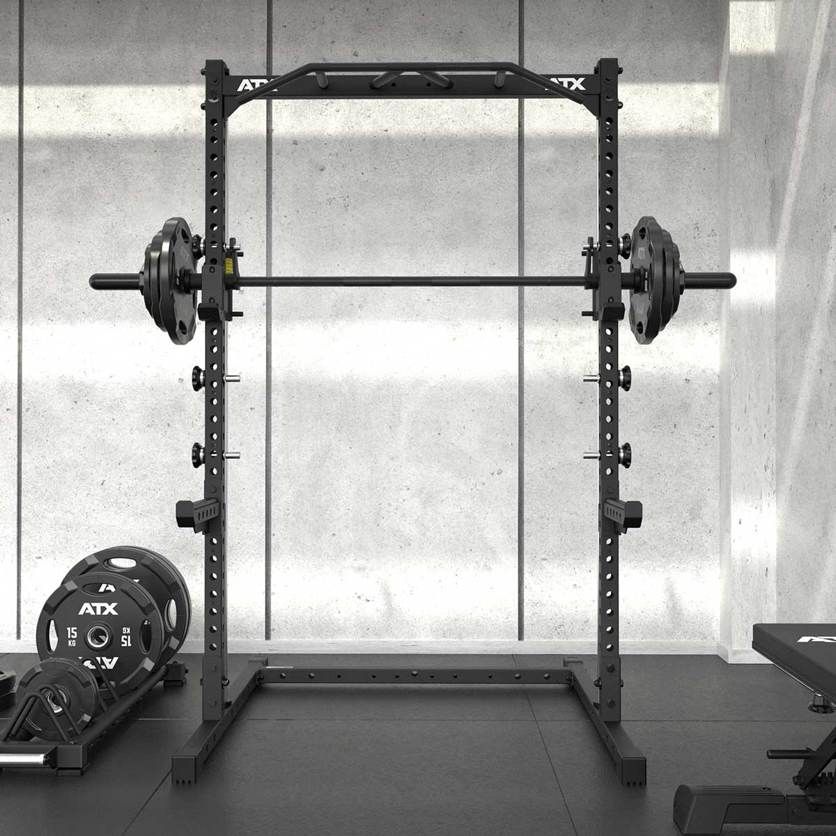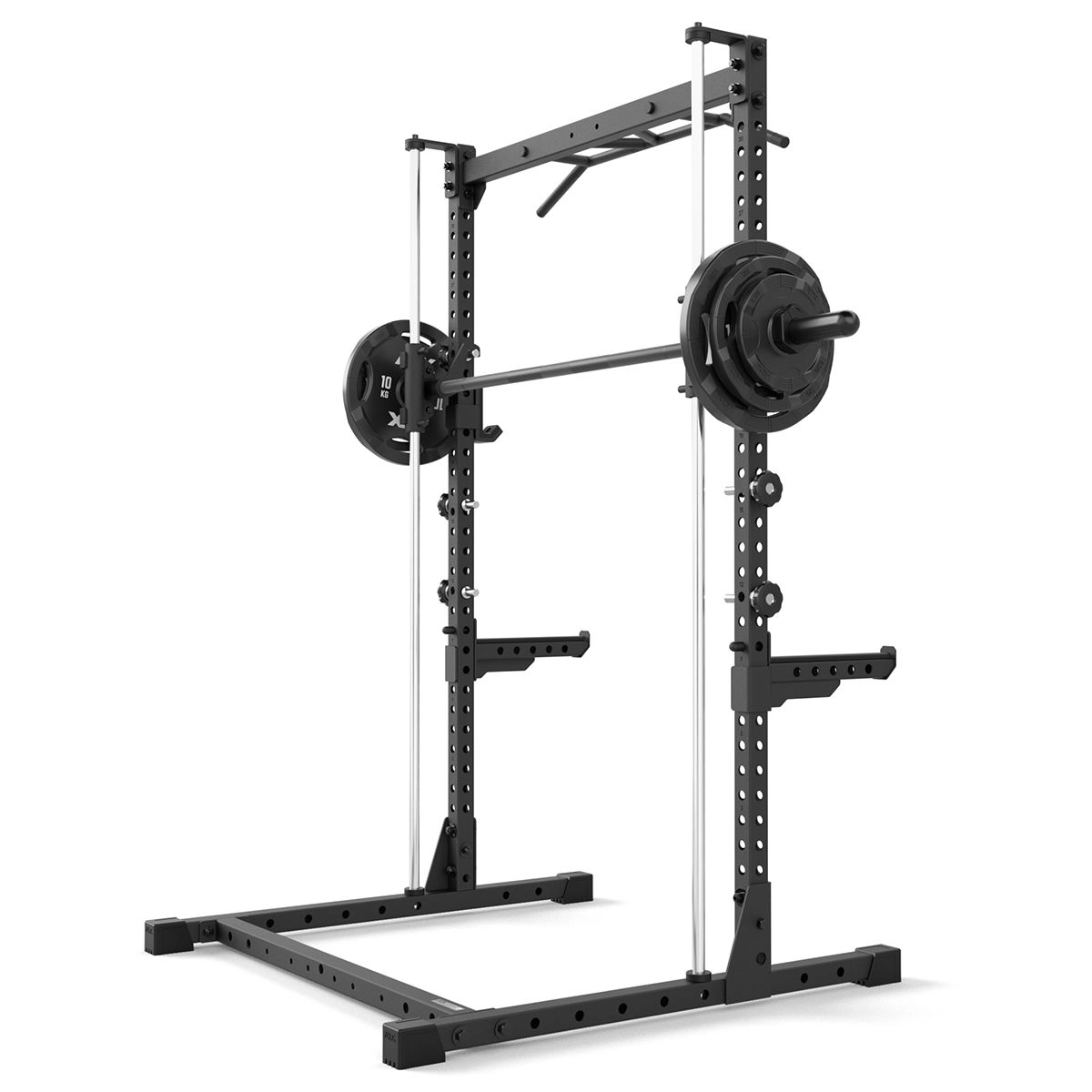 | MAXIMALE RANGE OF MOTION Extra tiefer Ansatz und extra hoher Auslauf der Führungswellen gewähren größtmöglichen Bewegungshub. | START-ABLAGEBOLZEN AUS VOLLSTAHL 6 Start-Ablagebolzen sind schnell und einfach individuell am Rack sicher fixierbar. |