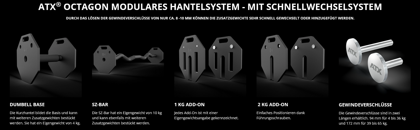 | MÖGLICHE ABSTUFUNGEN JE KURZHANTEL* | 4 kg, 6 kg, 8 kg, 10 kg, 12 kg, 14 kg, 16 kg, 18 kg, 20 kg, 22 kg, 24 kg, 26 kg, 28 kg, 30 kg, 32 kg, 34 kg, 36 kg *Mit den optional erhältlichen ATX® Add-ON Flex Plates (flexible Zusatzgewichte) erweiterbar, was eine noch feinere Abstufung von +0,25 kg, +0,5 kg und +1 kg ermöglicht. |