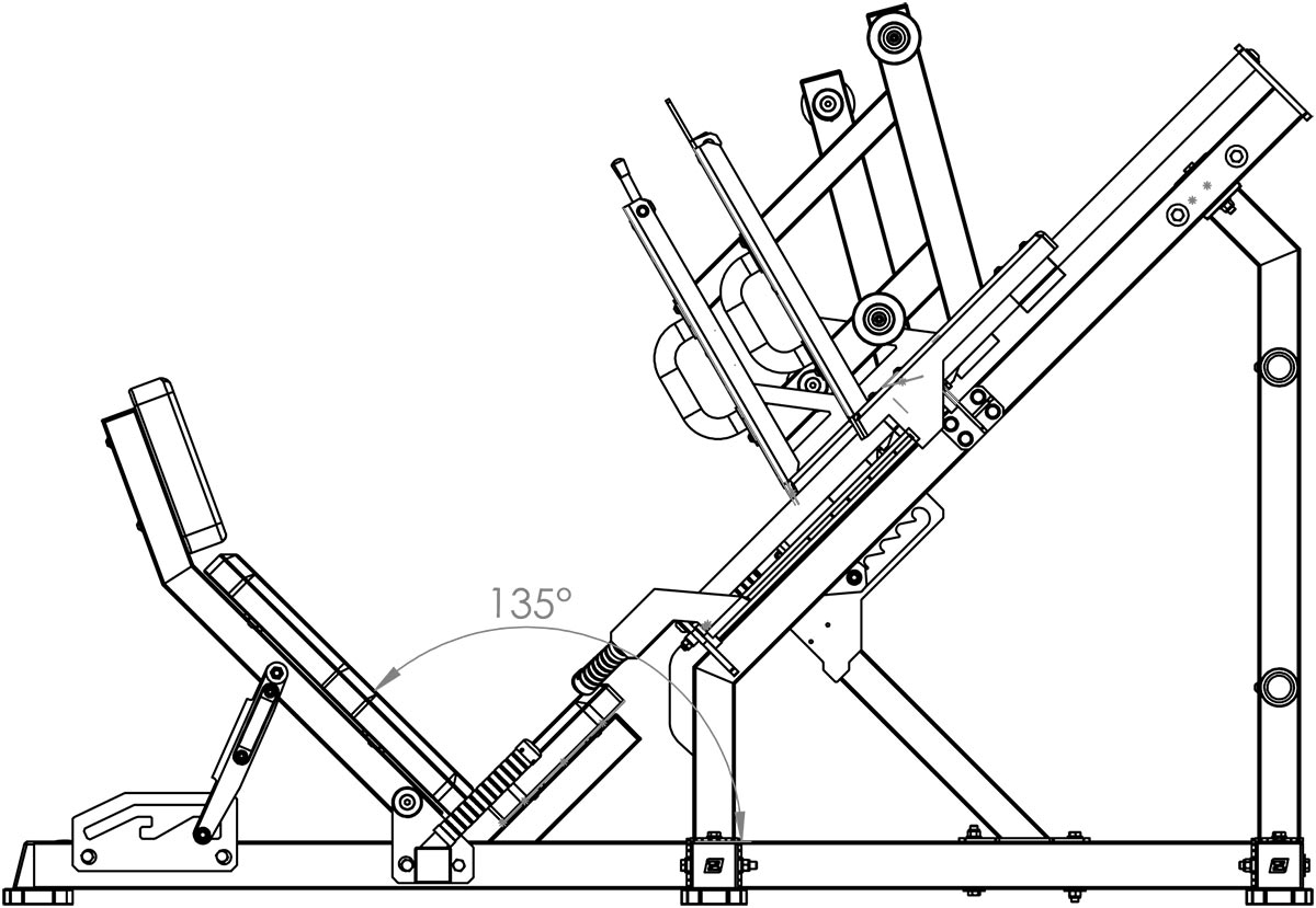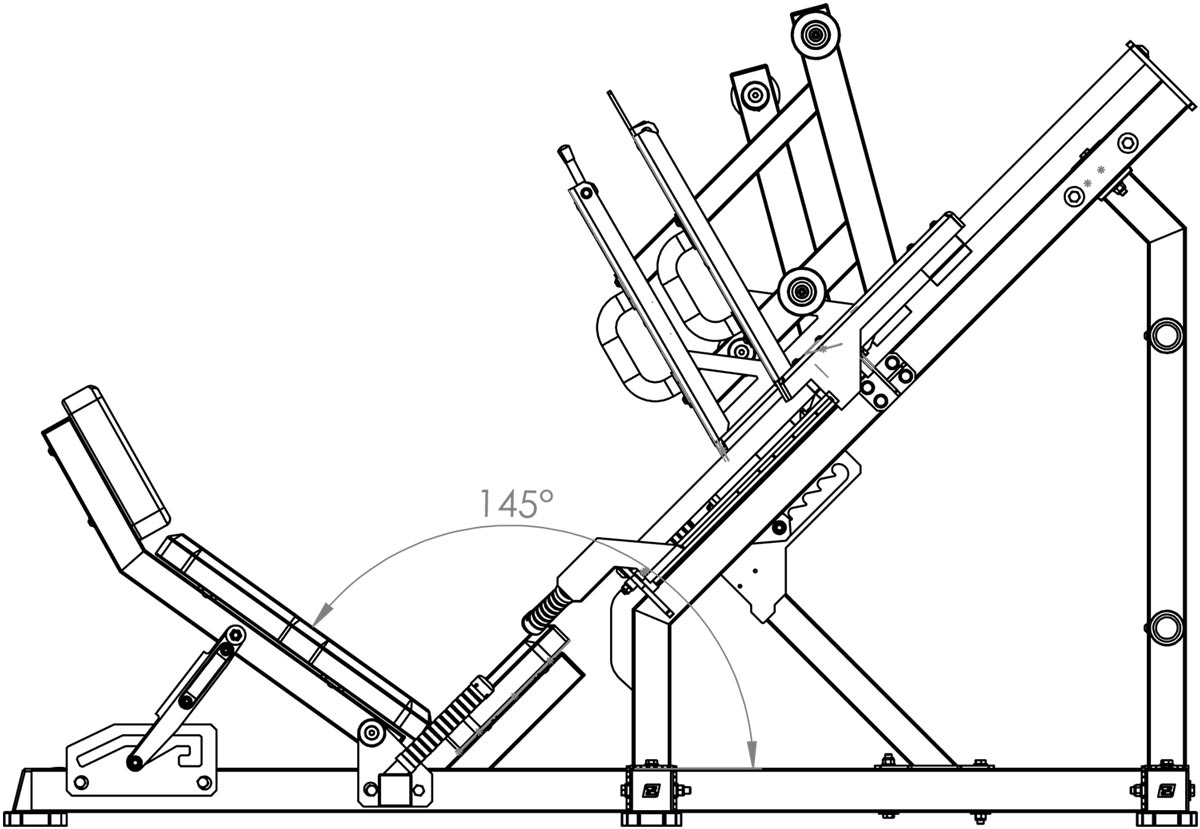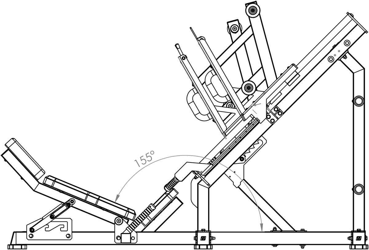 Die Maschine verfügt über verstellbare Sicherheitsbolzen zur Anpassung der Bewegungstiefe sowie über rutschfeste Fußplatten aus Edelstahl, hochwertige 40-mm-Linearführungen und ein dreifach verstellbares Rückenpolster für maximale Leistung, Sicherheit und Komfort.