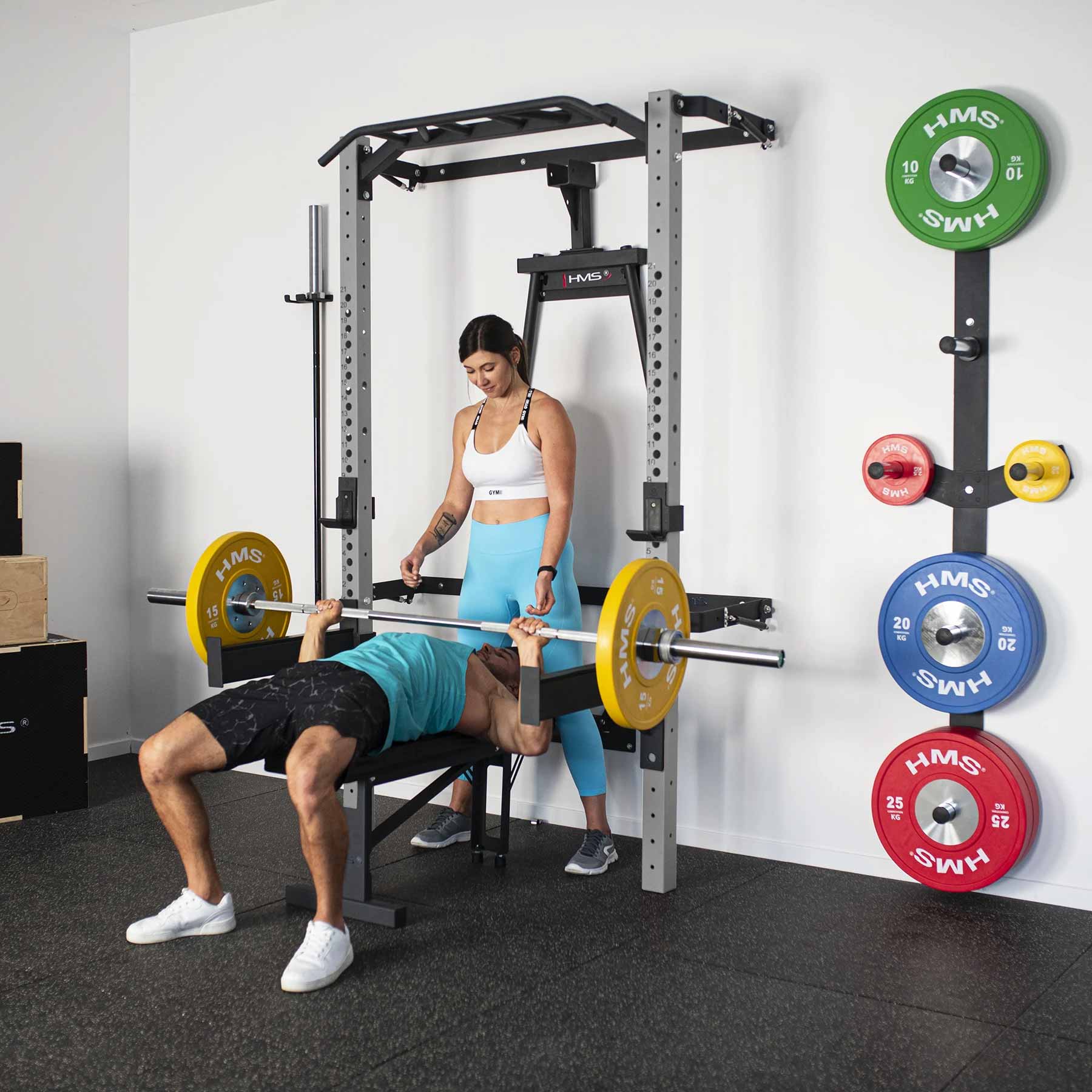 Abgerundet wird das System durch eine stabile Wandhalterung zur Aufbewahrung von zwei Langhantelstangen. Diese sorgt für Ordnung, Sicherheit und schnellen Zugriff während des Trainings.