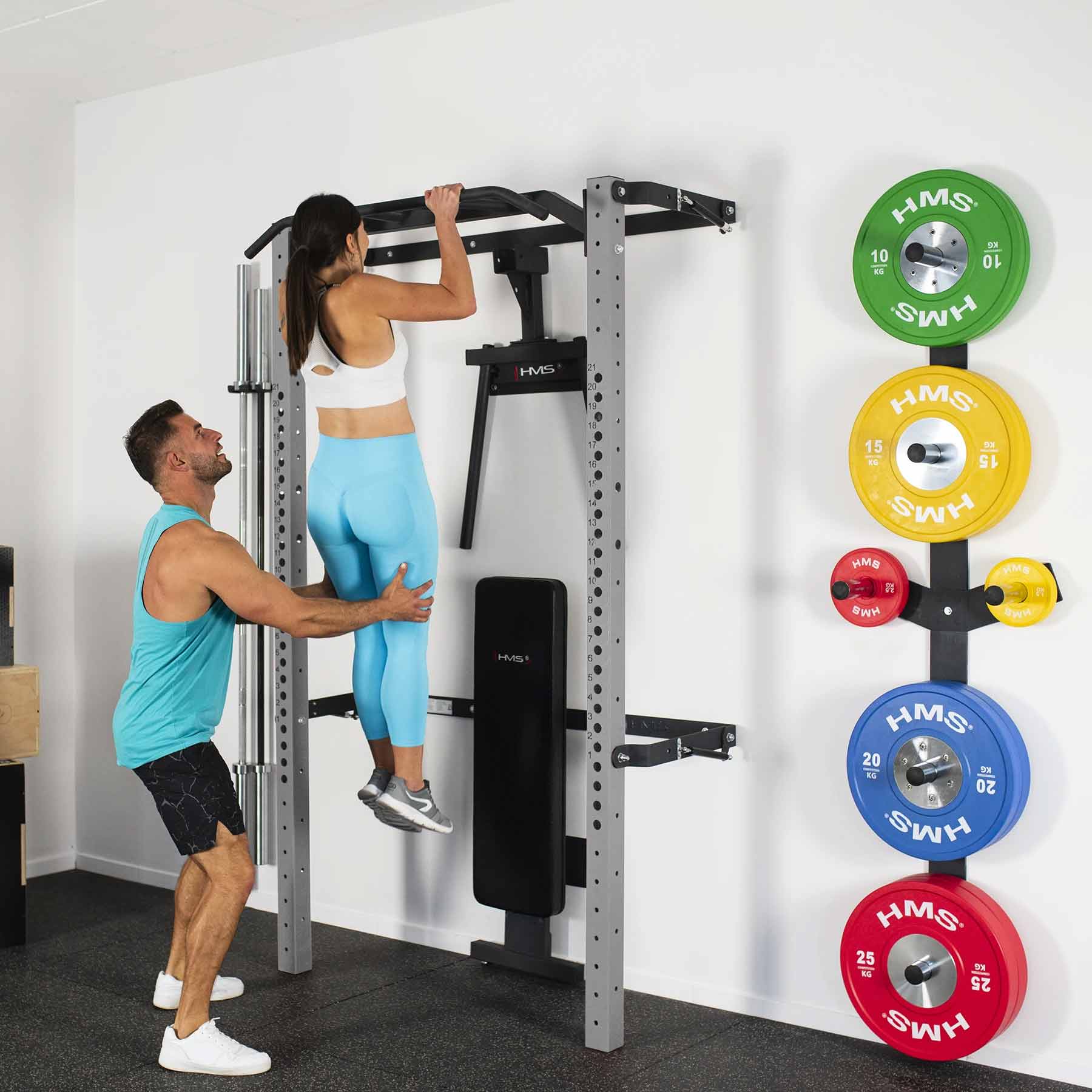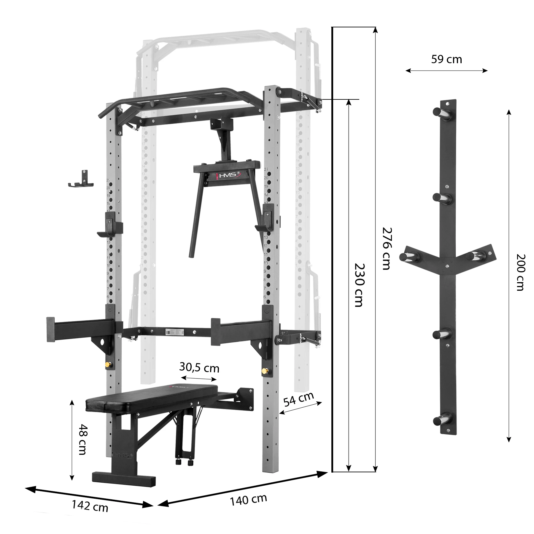 Die integrierte Klimmzugstange bietet mehrere Griffvarianten und ermöglicht ein effektives Training von Rücken-, Schulter- und Brustmuskulatur. Klimmzüge gehören zu den effektivsten Übungen für den Oberkörper, da sie mehrere Muskelgruppen gleichzeitig aktivieren. Ergänzt wird das System durch höhenverstellbare Langhantelhaken, die flexibel positioniert werden können und sich optimal an unterschiedliche Übungen anpassen lassen.