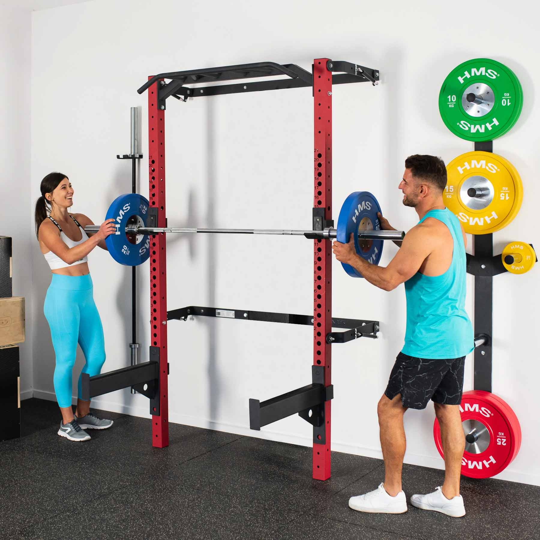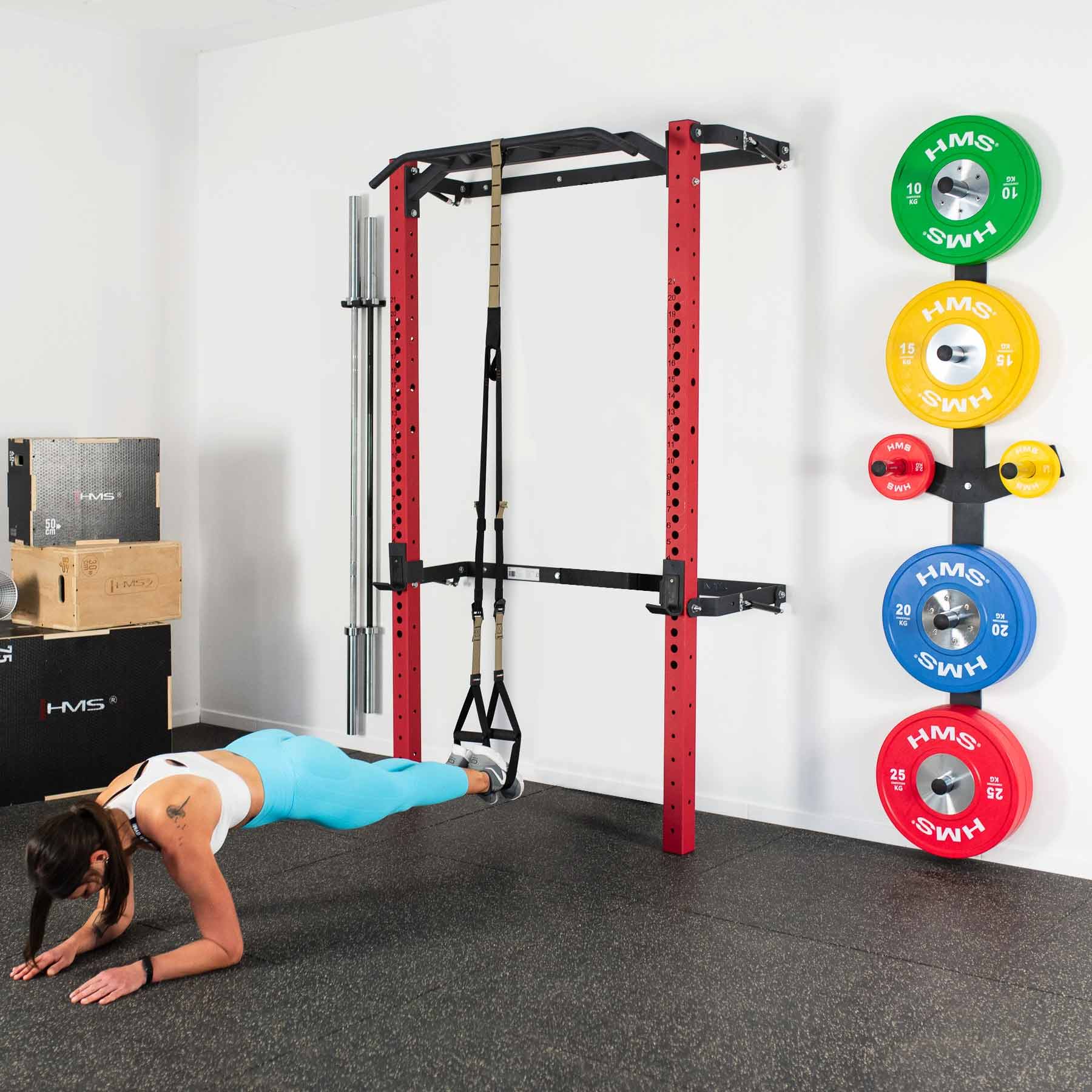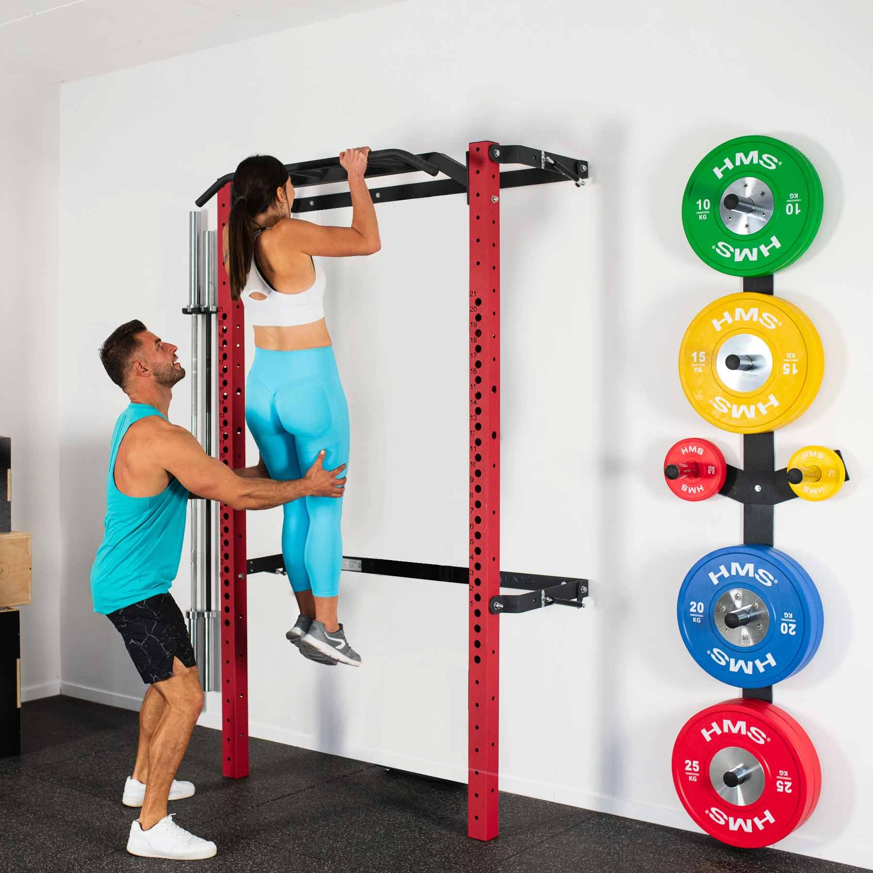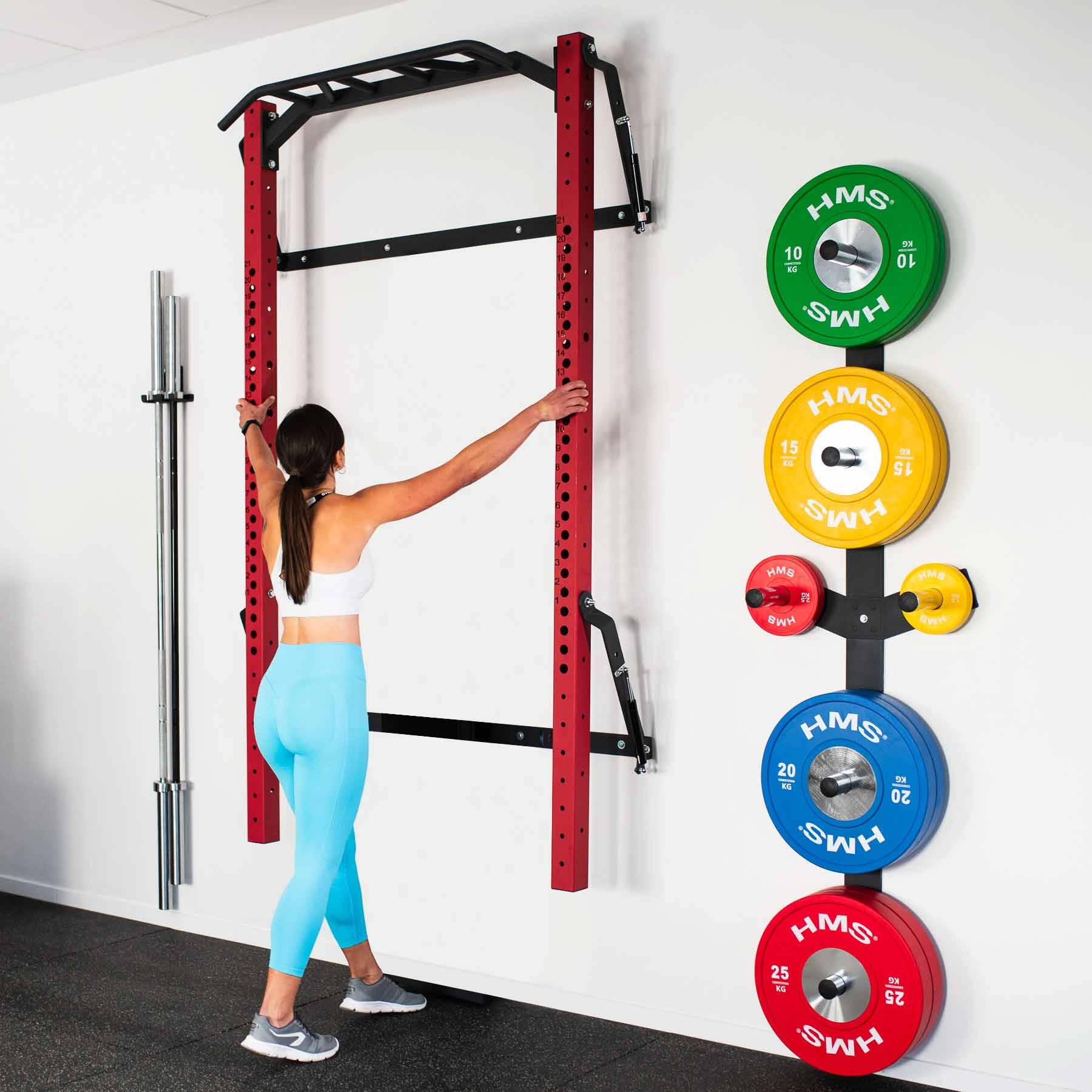 Das Fold Back Wall Rack KLT23 von HMS in Rot wurde entwickelt, um aktuellen Markttrends zu entsprechen und selbst anspruchsvolle Homegym-Nutzer zu überzeugen. In dieser Variante wird das Wall Rack mit Klimmzugstange, Langhantelhaken und Sicherheitsstützen geliefert und bietet damit eine solide Basis für vielseitiges Krafttraining zu Hause.