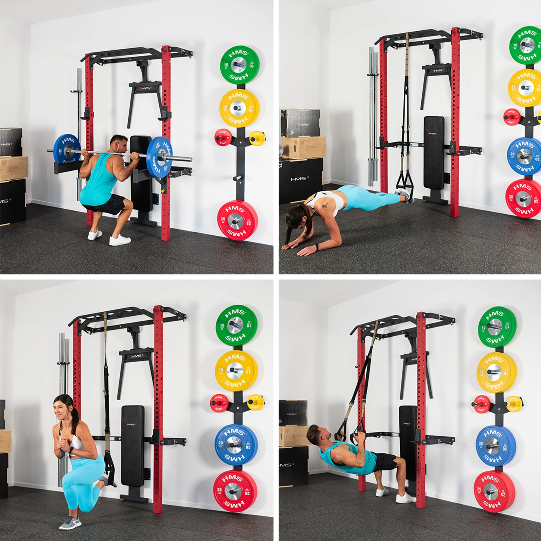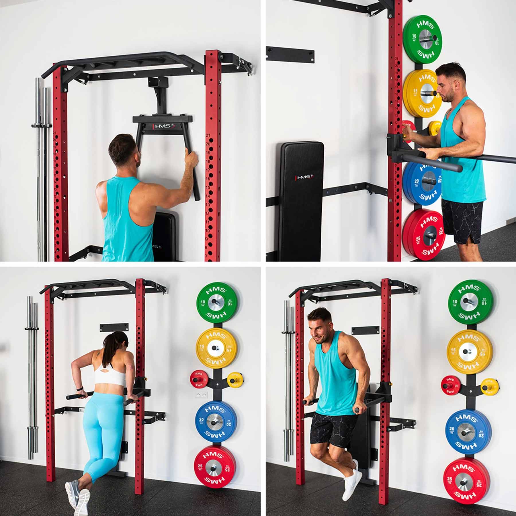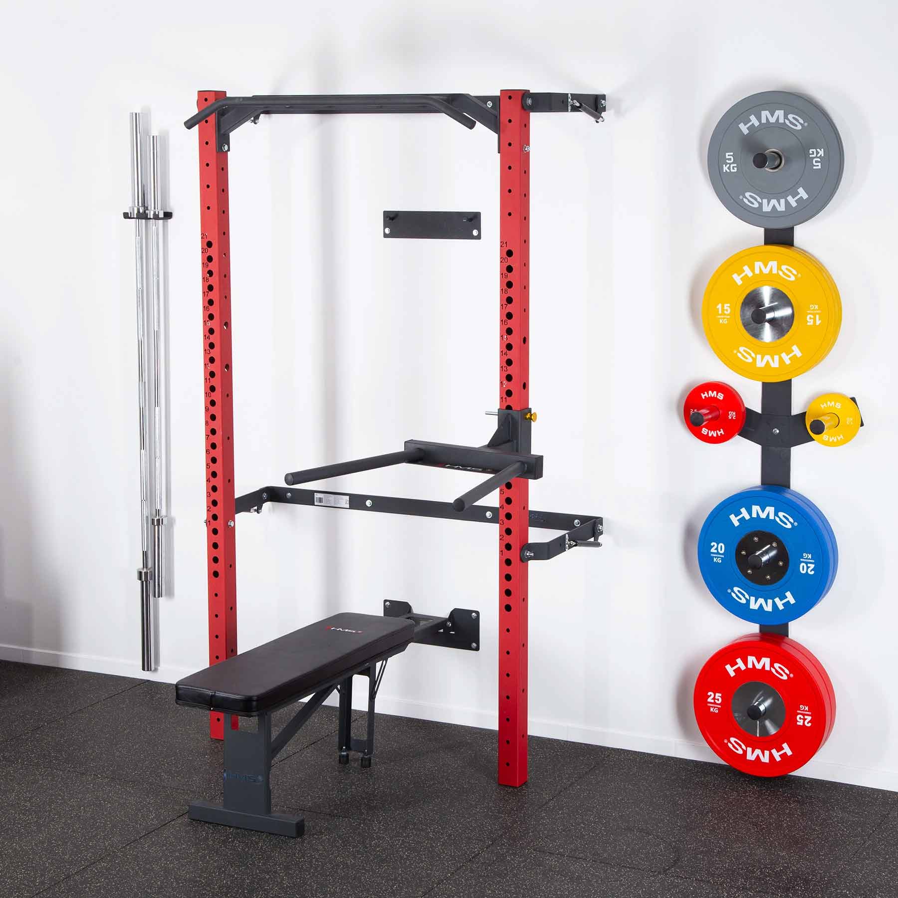 Diese Variante wird inklusive umfangreichem Zubehör geliefert. Neben der Klimmzugstange, Langhantelhaken und Sicherheitsstützen gehören eine klappbare Trainingsbank, eine Dip-Station, eine wandmontierte Gewichtsablage sowie eine Halterung für Langhantelstangen zum Lieferumfang. Das System erweitert das Trainingsspektrum deutlich und schafft gleichzeitig strukturierte Aufbewahrungsmöglichkeiten für die gesamte Ausrüstung.