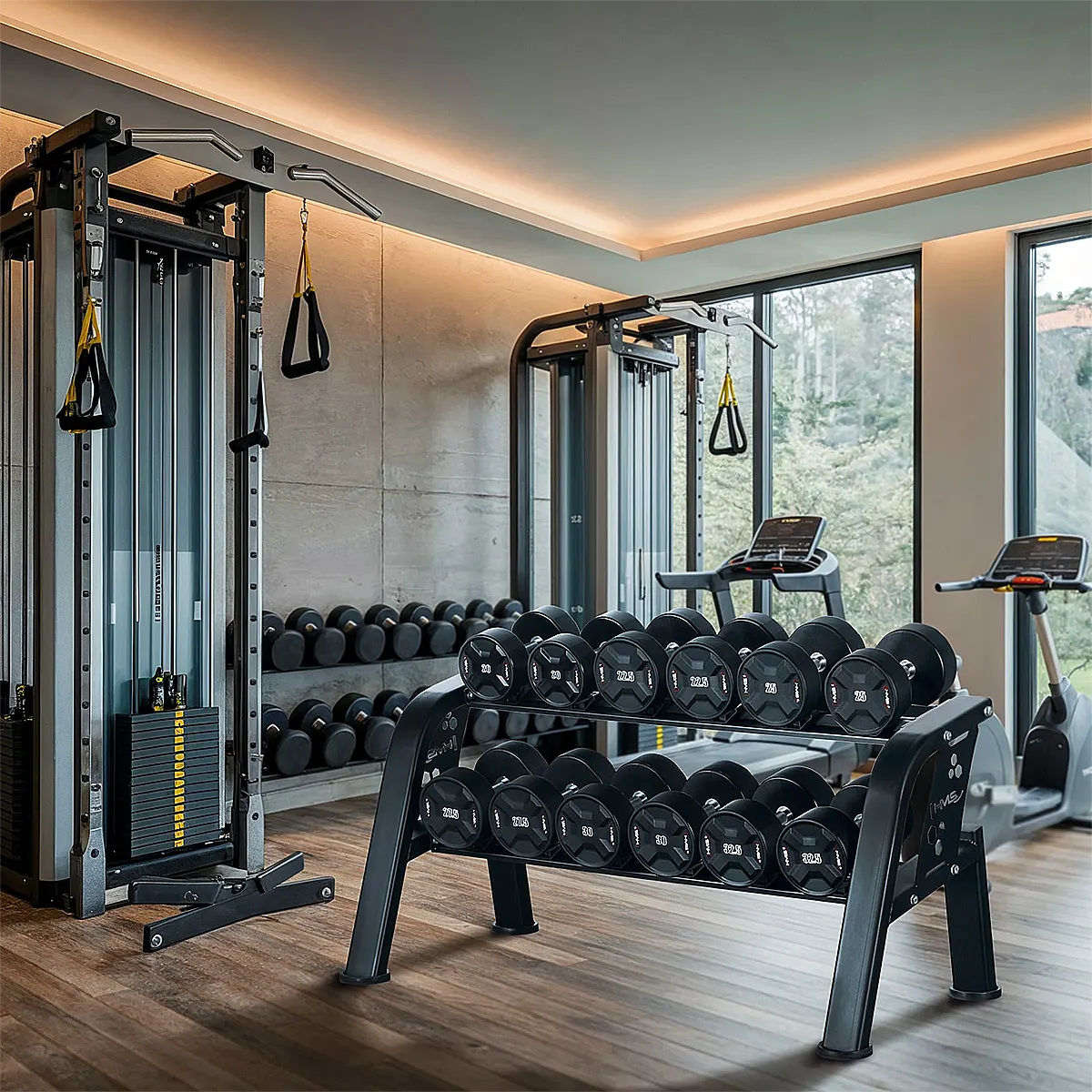 Die Halbschalen bieten optimale Führung für runde Kurzhanteln und sorgen für ein sauberes, professionelles Erscheinungsbild im Trainingsraum.