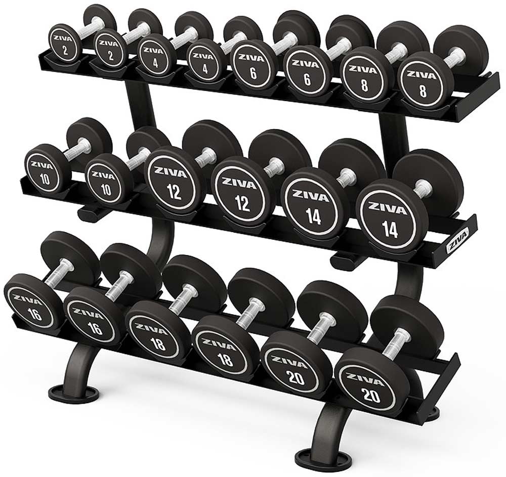 Das ZIVA XP 10-Paar, 3-stufige Kurzhantel-Rack mit Satteln bietet eine effiziente Lösung zur Aufbewahrung Ihrer Kurzhanteln. Dank eines kompakten Rahmens mit e…